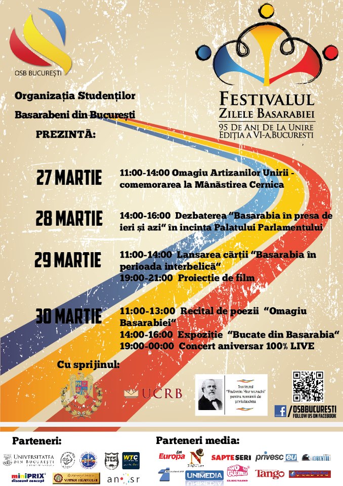 Pe 27 martie se împlinesc 95 de ani de la Unirea Basarabiei cu România. Cu această ocazie, Organizaţia Studenţilor Basarabeni din Bucureşti desfășoară la Bucureşti, între 27-30 martie, cea de-a VI-a ediţie a Festivalului “Zilele Basarabiei”.
