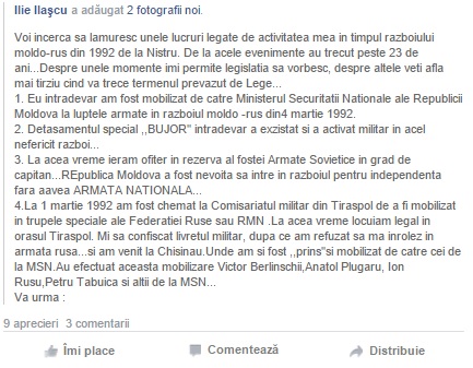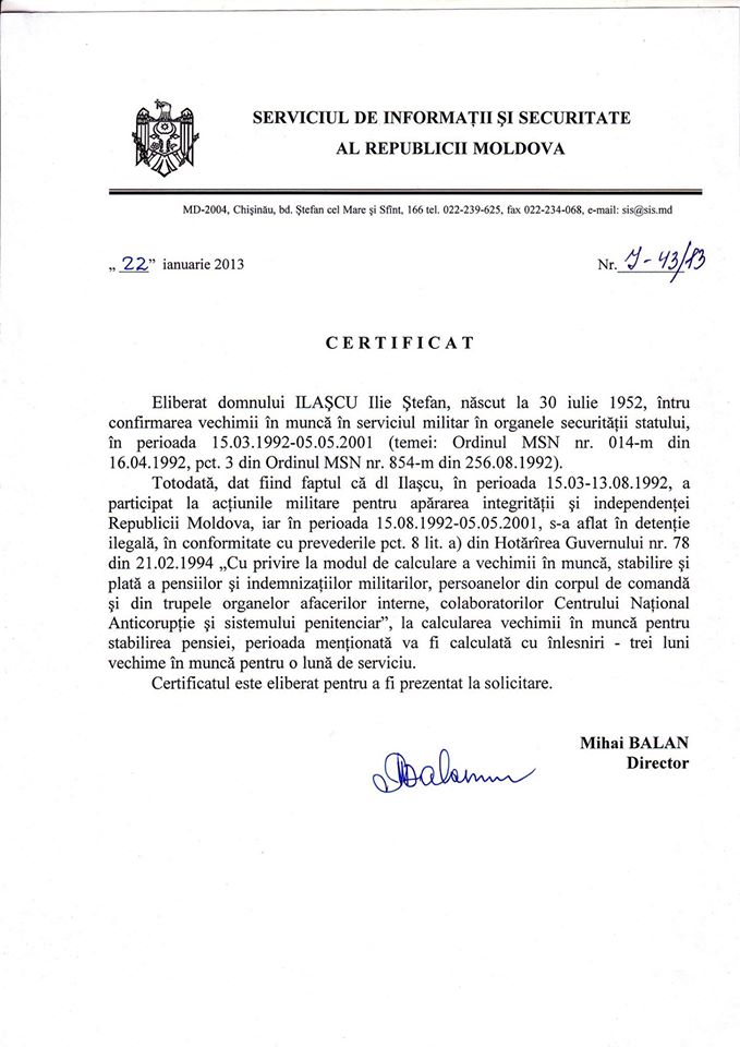 Fostul deputat în primul Pralament al Republicii Moldova și fost senator în Parlamentul României, Ilie Ilașcu, a publicat pe pagina sa de facebook un șir de documente care ar demonstra că acesta a fost angajat al Ministerului Securității Naționale, în prezent Serviciul de Informații și Securitate (SIS), în perioada războiului de Nistru din 1992.